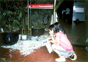 秩序一失控,眾多的歌迷不顧一切地往書(shū)城里面擁,而保安則用盡全力往外推-----突然驚叫聲連連,原來(lái)書(shū)城高大的玻璃門(mén)竟然被擠碎了!據(jù)現(xiàn)場(chǎng)的受傷歌迷介紹,當(dāng)時(shí)玻璃碎片、渣滓從天而降,一個(gè)女歌迷的臉被推擠在被血染紅的玻璃尖刺上無(wú)法動(dòng)彈!書(shū)城工作人員連忙打120叫來(lái)了急救車(chē),把受傷的女歌迷送到了四川省人民醫(yī)院急診室。記者在現(xiàn)場(chǎng)看到其中一個(gè)女孩的后頸處有一道約5厘米長(zhǎng)的血口,另一個(gè)女孩則腳淌鮮血,一瘸一拐地走來(lái);她們?cè)颈凰偷襟w育醫(yī)院,但因?yàn)橐p針才被轉(zhuǎn)送到省醫(yī)院來(lái)的。