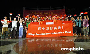 一百多名來(lái)自美國(guó)、英國(guó)、委內(nèi)瑞拉、巴西、馬來(lái)西亞、印尼、緬甸等七個(gè)國(guó)家和香港、澳門(mén)特別行政區(qū)的華裔青年,二十五日晚在廣州華南師大與廣州青年歡聚一堂。印尼華裔青年在聯(lián)歡會(huì)上表演節(jié)目。作者:羅仰明