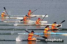 中國國家皮劃艇隊女子皮艇運(yùn)動員七月二十七日在山東日照水庫訓(xùn)練基地進(jìn)行奧運(yùn)賽前模擬實戰(zhàn)訓(xùn)練,備戰(zhàn)雅典奧運(yùn)會。作者:張勤