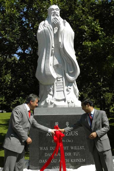 據(jù)大公網(wǎng)報(bào)道,這尊孔子雕像高2.5米,由細(xì)質(zhì)白麻花崗巖雕刻而成,基座上刻著“己所不欲,勿施于人”的孔子名言。它是中國國務(wù)院新聞辦贈(zèng)送給柏林市的禮物。