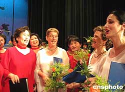 八月二日晚在北京朝陽(yáng)文化館內(nèi),來(lái)自以色列娜瑪女子合唱團(tuán)和北京"鳳朝陽(yáng)"合唱團(tuán)的成員們?cè)谝黄鸷铣袊?guó)民歌"小白菜"。娜瑪女子合唱團(tuán)是以色列當(dāng)今最領(lǐng)先的聲樂(lè)團(tuán)體之一,并在江蘇無(wú)錫舉辦的第七屆中國(guó)國(guó)際合唱節(jié)上獲一等獎(jiǎng)。作者:韓藝冰