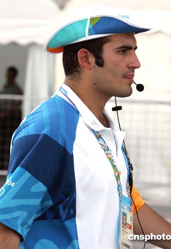 (當(dāng)?shù)貢r(shí)間)二○○四年八月三日清晨,一名英俊的雅典奧運(yùn)會(huì)男志愿者在記者新聞中心外調(diào)度穿梭巴士。中新社記者:任晨鳴