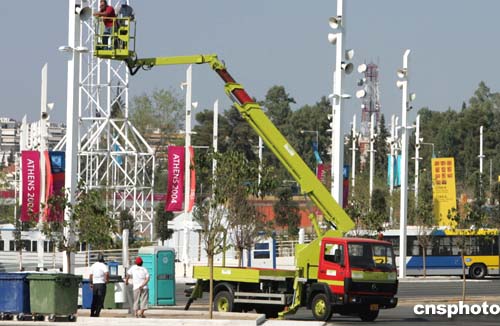 (當(dāng)?shù)貢r間)二○○四年八月三日,希臘雅典奧運會主體育場外的配套工程緊張進行,工人們冒著烈日安裝擴音設(shè)施。中新社記者:任晨鳴