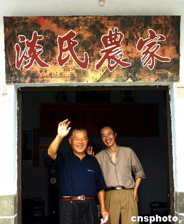 走近“淡氏農(nóng)家”,房門一側(cè)立著一個(gè)十平方米大的巨幅彩色廣告牌,這是淡老花二千多塊錢制作的。進(jìn)入堂屋,正對(duì)面便寫著“小平舅父淡以興之家”,左下邊與當(dāng)?shù)卮迕窦依镆粯,掛著一幅小平畫像,上面印著“翻身不忘共產(chǎn)黨,致富更思鄧小平”。兩側(cè)則掛滿了小平與家人在一起的照片、淡老自己與國(guó)家領(lǐng)導(dǎo)人的合影等。