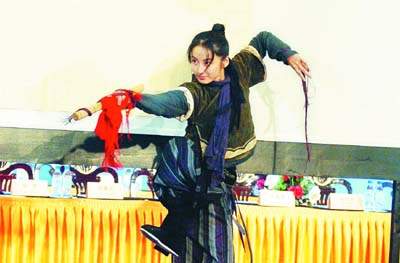 也許是受了最近幾部大片首映式的啟發(fā),昨晚《七劍》的發(fā)布會別開生面幾乎成了一臺演出秀。一開場,《指環(huán)王》的電影音樂把徐克希望的“史詩般武俠”渲染得恰如其分,接著劇中扮演俠士的群眾演員穿著古裝輪番登場舞劍。在電影《少林寺》中有過出色表現(xiàn)的老演員于承惠,亮出了自己的絕活——現(xiàn)場揮墨寫下了“七劍下天山”幾個大字。