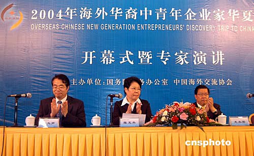 八月十日,由國(guó)務(wù)院僑務(wù)辦公室、中國(guó)海外交流協(xié)會(huì)聯(lián)合主辦的“2004年海外華裔中青年企業(yè)家華夏行”在北京舉行開(kāi)幕式。國(guó)僑辦主任陳玉杰(中)與博鰲亞洲論壇秘書長(zhǎng)龍永圖(右)、國(guó)僑辦副主任許又聲(左)出席開(kāi)幕式。來(lái)自十七個(gè)國(guó)家和地區(qū)的五十余位代表未來(lái)幾天將在北京參加各種交流活動(dòng)以拓展商機(jī)。作者:徐曦弋