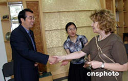 八月十一日,國務院僑辦副主任許又聲(左)在北京華文學院會見了塞爾維亞和黑山貝塔通訊社社長柳比察·馬爾科維奇。中新社記者:史利