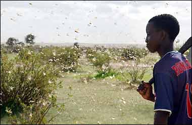目前這一地區(qū)現(xiàn)在面臨著15年來最為嚴(yán)重的一次蝗災(zāi),大批的沙漠蝗蟲正從西北非侵襲毛利塔尼亞,馬里以及尼日利亞,在這一地區(qū),很多都是依靠農(nóng)業(yè)生活的人。蝗災(zāi)爆發(fā)時(shí),一群群的蝗蟲鋪天蓋地,烏云蔽日般東奔西撞,它們所到之處,各種綠色植物均遭暴殄,慘不忍睹。1988年,非洲的塞內(nèi)加爾和毛里塔尼亞境內(nèi),發(fā)生了數(shù)十年罕見的蝗災(zāi),僅一群蝗蟲就可達(dá)1000億只以上。