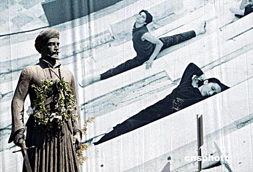 雅典街頭的古代石像與奧運廣告牌相互映襯,別據一格。中新社記者:王瑤