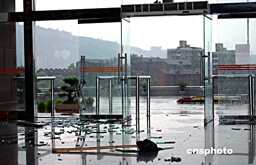 八月十二日下午四時許,山城重慶突降暴雨,給一度氣溫達到四十?dāng)z氏底的“火爐”帶來了些許涼爽。暴雨造成重慶多處路段積水嚴(yán)重、行道樹、電線桿被吹倒,同時造成了一定程度的交通堵塞。圖為一展館玻璃門被風(fēng)吹垮,玻璃散落一地。作者:郭晉嘉