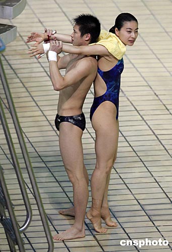 雅典時間八月十二日下午,中國女子跳水名將郭晶晶在隊(duì)友的幫助下進(jìn)行奧運(yùn)賽前訓(xùn)練的準(zhǔn)備活動。中新社記者:毛建軍