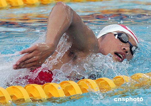 中國游泳名將齊暉當(dāng)?shù)貢r間八月十二日晚在雅典奧運賽場進(jìn)行熱身訓(xùn)練。中新社記者:毛建軍