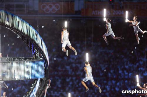 當(dāng)?shù)貢r間八月十三日晚,第二十八屆奧運會在希臘雅典開幕。圖為奧運開幕式上的飛天表演。中新社記者:毛建軍