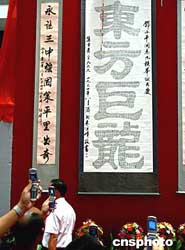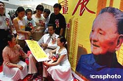 著名書畫家朱繼峰創(chuàng)作的巨法書法作品《東方巨龍》,八月十四日在深圳舉辦的紀(jì)念鄧小平誕辰一百周年書畫展上出展,這幅用九百九十九個(gè)“壽”字組成的作品,一九九四年被鄧小平家人收藏。中新社記者:宋吉河