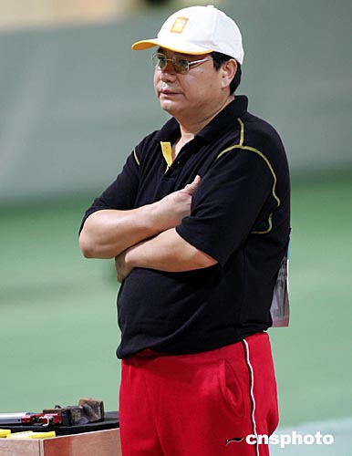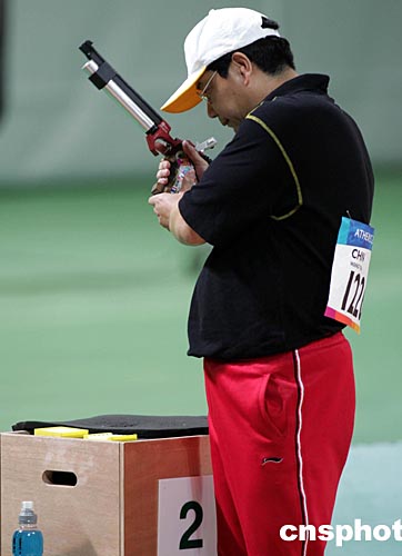 當(dāng)?shù)貢r間八月十四日下午雅典奧運(yùn)會男子十米氣手槍比賽中,四十四歲的中國“老槍”王義夫一直落后于一名俄羅斯選手,在擊發(fā)最后一顆子彈時,他冷靜沉思片刻后一槍將金牌“擊落”。中新社記者:任晨鳴