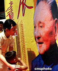 八月十五日在深圳舉辦的朱繼峰紀(jì)念鄧小平誕辰一百周年書(shū)畫展上,兩位小朋友在鄧小平畫像前。對(duì)鄧小平有特殊感情的深圳人目前正采取多種形式紀(jì)念這位偉人。中新社記者:宋吉河