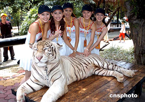 八月十五日,第五屆明日之星影視新星的入選選手來到廣州番禺香江野生動(dòng)物世界拍攝外景。圖為美女與白老虎合影。作者:劉衛(wèi)勇
