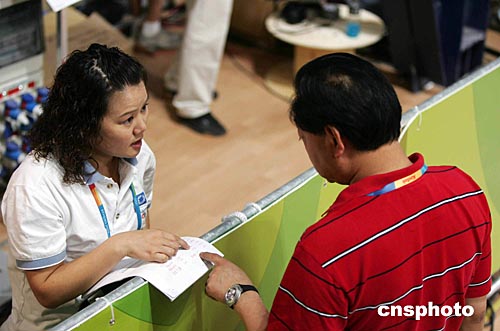 當?shù)貢r間八月十五日上午,在雅典舉行的第二十八屆奧運會女子十米氣手槍射擊決賽賽場,中國射擊隊前奧運冠軍張山為中央電視臺做主持人客串記者。圖為張山與中國射擊隊教練許海峰在場邊交談。中新社記者:毛建軍