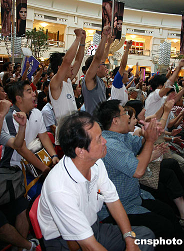 出征雅典奧運會的中國臺北棒球隊16日下午以3:0戰(zhàn)勝澳大利亞隊。圖為狂熱的棒球迷聚集臺北101大樓4樓,收看大屏幕直播。中新社記者:董會峰