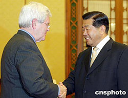 中新社北京八月十九日電(記者 邢利宇)中共中央政治局常委、全國政協(xié)主席賈慶林今天下午在人民大會堂會見了以美國前眾議院議長紐特·金里奇率領的美國對外政策理事會代表團。