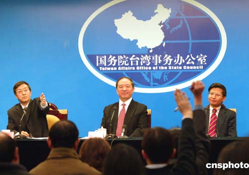 國(guó)臺(tái)辦一月十二日在北京舉行新聞發(fā)布會(huì),邀請(qǐng)國(guó)務(wù)院臺(tái)灣事務(wù)辦公室經(jīng)濟(jì)局局長(zhǎng)何世忠(中)、海峽兩岸航空運(yùn)輸交流委員會(huì)副理事長(zhǎng)浦照洲(右一)就臺(tái)商春節(jié)包機(jī)問題回答記者提問。作者:滿會(huì)喬