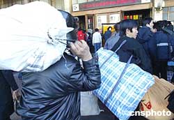 中國傳統(tǒng)農(nóng)歷新年春節(jié)將至,元月十二日北京眾多民工已開始陸續(xù)離京返鄉(xiāng),即將到來的二零零五年春運期間預(yù)計將運送旅客一億三千七百萬人次。圖為北京火車站離京返鄉(xiāng)的民工。作者:錢興強