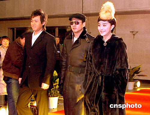 第七屆中國(guó)長(zhǎng)春電影節(jié)一月十二日晚在長(zhǎng)春落幕。在當(dāng)晚的頒獎(jiǎng)晚會(huì)上,眾多明星出席。圖為著名影星范冰冰(右)、周杰(中)和王學(xué)兵一同走過星光大道。作者:吳兆飛