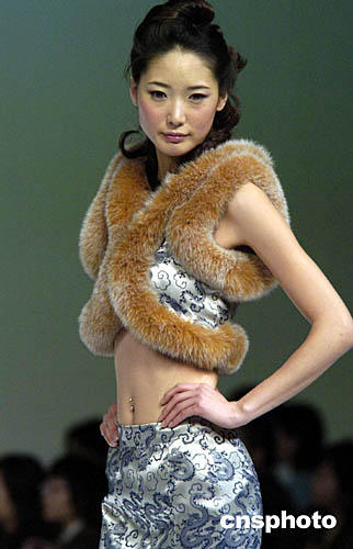 1月19日,香港會(huì)展中心舉行的“香港時(shí)裝節(jié)秋冬系列2005”上,模特展示一款皮草披肩。作者:洪少葵