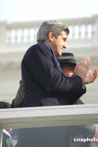 | 在去年底美國大選中敗給布什的民主黨參議員克里20日參加了布什就職典禮,坐在布什演講臺(tái)左側(cè)的第七排。在整個(gè)儀式過程中,克里表情嚴(yán)肅,神情落寞。當(dāng)布什宣誓完畢,全場歡呼時(shí),克里有禮貌地鼓掌,他身旁的另一位嘉賓拍拍他的后背,似在安慰克里。作者:余東暉