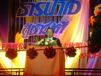 張大使在致辭中表示,泰國(guó)政府和人民面對(duì)突如其來(lái)的海嘯災(zāi)難,反應(yīng)迅速,措施有力,在很短的時(shí)間內(nèi)取得了階段性成果。中國(guó)政府和人民對(duì)泰國(guó)遭災(zāi)十分關(guān)注。胡錦濤主席和溫家寶總理致電慰問(wèn),中國(guó)政府派出醫(yī)療隊(duì)和DNA專家組協(xié)助救災(zāi)。中國(guó)國(guó)內(nèi)各界群眾、海外華人華僑、中資機(jī)構(gòu)和留學(xué)生掀起了一波波捐款熱潮!耙环接须y,八方支援”,這一中華民族的優(yōu)良傳統(tǒng)發(fā)揚(yáng)光大到了一個(gè)新的高度。