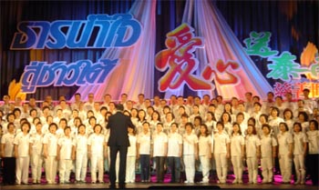晚會(huì)在對(duì)泰國(guó)海嘯遇難者的默哀中拉開帷幕。中國(guó)大使館、中華總商會(huì)等多個(gè)合唱團(tuán),圍繞著愛(ài)心這一主題,表演了許多感人的曲目。