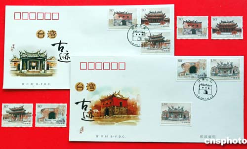| 北京市郵票公司為配合國家郵政局于2005年1月30日發(fā)行《臺灣古跡》特種郵票(1套5枚),特設(shè)計(jì)印制了該郵票的首日封(圖)、郵折等郵品,并將與郵票同日發(fā)行!杜_灣古跡》特種郵票面值分別是四枚為80分、一枚為1.50元人民幣。郵票名稱分別為“臺北府城北門”、“臺南孔子廟”、“鹿港龍山寺”、“臺南二鯤身炮臺”、“澎湖天后宮”。作者:鄒憲
