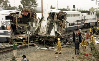 警方和救援人員稱,初步調(diào)查表明這起重大交通事故是由一名打算自殺的年輕人將汽車停在鐵路軌道上造成的。事發(fā)時(shí),一列往南行進(jìn)的輕軌列車在洛杉磯地區(qū)的格倫代爾鎮(zhèn)撞上這名年輕人停放在軌道上的吉普車后出軌,又與另一列往北行進(jìn)的輕軌列車相撞,車廂翻倒。