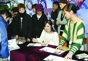 不少歌迷為了能搶占到與娜拉親密接觸的最佳位置,一大早便趕到音像店內(nèi)等候。當娜拉帶著招牌式的可愛笑容現(xiàn)身時,現(xiàn)場數(shù)百名歌迷立刻炸開了鍋。簽售過程中臺下眾人你推我攘好不熱鬧,拿到簽名的歌迷興奮地聚在一起展示自己的“戰(zhàn)果”,即便是不買專輯的顧客也駐足在人群外觀看。現(xiàn)場近乎失控的局面讓稀有文化工作人員一邊忙著維持臺上的秩序,一邊忙著呼吁臺下歌迷不要擁擠耐心等待。無奈娜拉的無敵萬人迷魅力,讓不少原本負責維持秩序的音像廣場工作人員和保安都被徹底征服,不時地伸長脖子去看臺上的娜拉。而記者通道的管理人員只顧把關(guān)記者的進入,絲毫不理會周遭擁擠的歌迷。(朱雅清)