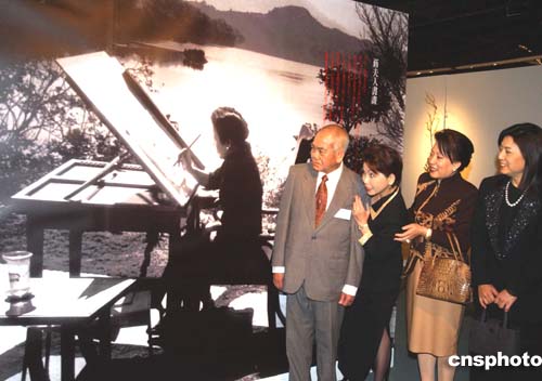 “世紀(jì)蔣宋美齡文物展”二月一日在美國洛杉磯開幕。宋美齡孫媳蔣方智怡(右一)、宋家代表宋曹琍璇(右二)與《世界日報》社長蘇民生夫婦一起,觀賞宋美齡創(chuàng)作國畫的巨幅照片。作者:賈國榮