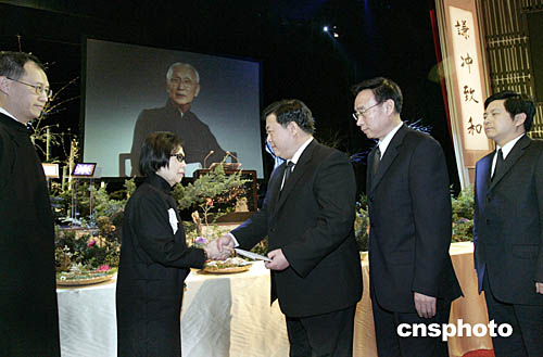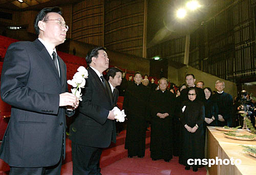 海協(xié)會(huì)會(huì)長(zhǎng)汪道涵的個(gè)人代表孫亞夫、李亞飛在追思會(huì)上獻(xiàn)花。