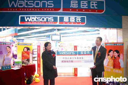 中新網(wǎng)北京二月三日電(記者張希敏)春節(jié)將至,位于北京東方廣場的屈臣氏個人護理商店,今天在重張之際,繼續(xù)向中國兒童少年基金會“春蕾計劃”捐款二十五萬元人民幣,用以救助失學女童。