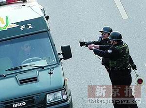 春節(jié)期間,為加強對金融單位的保護,北京市公安局進行了一次攔截被搶運鈔車的演習。下午1時30分左右,左安門橋下的南二環(huán)向西的主路上,車流如梭,一輛綠色的北京振遠護衛(wèi)運鈔車在車流中見縫插針地飛速前行,三四輛警車緊隨其后,旁邊的車輛很快讓出路來?匆妿讉路口全部有警方布控后,運鈔車繼續(xù)朝前“逃竄”,并從開陽橋往北,駛向菜市口大街。