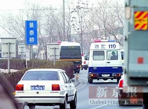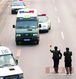 在健宮醫(yī)院西門口,菜市口大街由南向北主路停止行車。三名刑警呈三角狀,站在主路中央。約5分鐘后,三輛警車夾著一輛綠色的運鈔車駛來,在離“三人陣”50米遠處,前排的刑警對運鈔車舉起禁行標志。與此同時,兩輛警車向運鈔車靠攏。