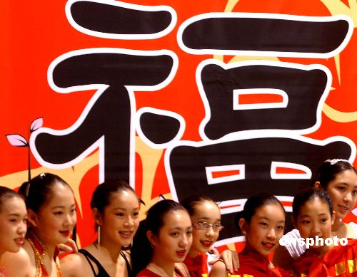 美國(guó)洛杉磯一班華人少女聚到高大的福字下,在中國(guó)農(nóng)歷新年前夕先感受喜氣洋洋的氣氛。中新社記者:賈國(guó)榮