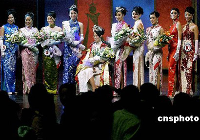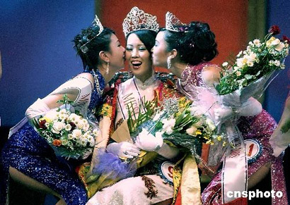 當?shù)貢r間二月十一日,第四十八屆全美華埠小姐競選在加州舊金山舉行。現(xiàn)年二十二歲、自達拉斯市的福建籍女孩陳盈璉(圖一,中)當選二00五年全美華埠小姐。圖二為當選中華總商會小姐的王曉玲(右)和當選舊金山華埠小姐的王穎(左)親吻陳盈璉表示祝賀。 作者:陳鋼