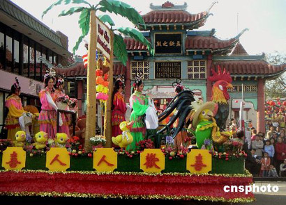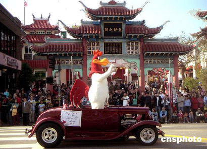 美國洛杉磯華埠二月十二日舉行第一百零六屆金龍大游行。圖一為賀歲彩車駛過唐人街,向華洋民眾祝賀中國農(nóng)歷雞年新春佳節(jié)的到來。圖二為華人和各種族民眾共同歡慶中國農(nóng)歷雞年。圖三為廣東潮州會館的金雞仙女彩車,為美國洛杉磯華埠二月十二日舉行的一百零六屆傳統(tǒng)金龍大游行錦上添花。 作者:賈國榮