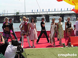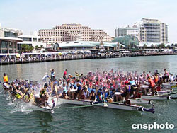 悉尼市2005年中國農(nóng)歷新年慶典活動的壓軸戲——龍舟競賽,于19日和20日在達令港隆重舉行。此次龍舟競賽共有近百個龍舟隊參加,爭奪不同年齡組別的冠軍。上圖為開幕典禮上的服裝表演。下圖為龍舟隊員戲水慶祝比賽開幕.作者:劉雨生