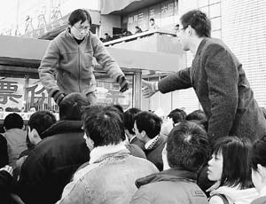 10時左右,人越來越多,市場前的紅旗路上人擠著人,綿延1公里,抬腳都困難,人群中不斷傳出被踩到腳的尖叫聲,10分鐘時間里,記者愣是沒走出200米。汽車、自行車和小商販的三輪車夾在人群中間動彈不得,209路公交車無奈只好改線,一位乘客嘟囔著:“早就該實行交通管制!彪m然主辦方明確規(guī)定不得在場外招聘,可路邊的“招聘”牌子還是一個挨著一個,散發(fā)的各種小廣告隨地可見,5元一張的門票被炒到10元。