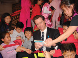 來(lái)自尤方玉屏中文學(xué)校的數(shù)十位小學(xué)生成為慶會(huì)的另一亮點(diǎn),這些滿臉稚氣的學(xué)童,排排坐在通往二層的樓梯上,簇?fù)碇贻p英俊的紐森市長(zhǎng),就像遇到偶像明星一樣,紛紛向他索要簽名。