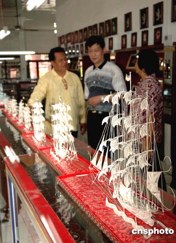 “探尋鄭和之路”的中新社二記者來(lái)到巴厘島民族村,這里留有鄭和下西洋深深的印記。在一銀飾展覽館,當(dāng)?shù)劂y匠為紀(jì)念鄭和下西洋600周年,用銀制成的鄭和下西洋寶船十分精美。銀店老板對(duì)記者說(shuō),鄭和下西洋開展海上貿(mào)易,給巴厘島帶來(lái)了繁榮,也使我們學(xué)會(huì)了中國(guó)精湛的制銀工藝。我們制作鄭和銀寶船,就是為了紀(jì)念鄭和這位偉大的航海家。作者:蔣振江