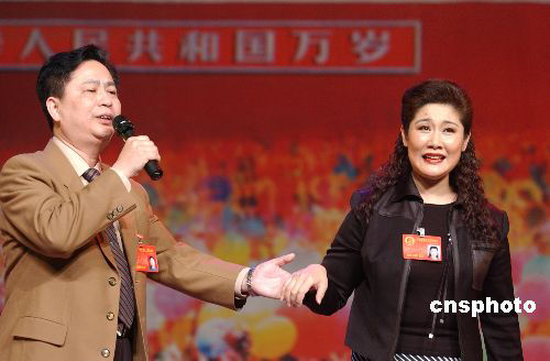 出席十屆全國人大三次會(huì)議的湖北、湖南、遼寧、臺(tái)灣代表,三月五日晚在駐地北京五洲大酒店舉行聯(lián)誼會(huì),湖北代表劉丹麗(右)與臺(tái)灣代表何大欣共唱一首民歌《月之故鄉(xiāng)》,慶祝大會(huì)開幕。作者:毛建軍