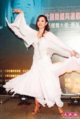 昨晚于臺(tái)師大分部舉行的“2005臺(tái)北國(guó)際標(biāo)準(zhǔn)舞大賽”,邀請(qǐng)中國(guó)、丹麥等舞林高手飆舞。劉真特地以一身雪白舞衣,擔(dān)任“國(guó)標(biāo)舞大使”唐誠(chéng)精采舞姿介紹人,她說:“唐誠(chéng)67歲才開始學(xué)舞,我會(huì)有今天這成就,受唐誠(chéng)影響很深。”