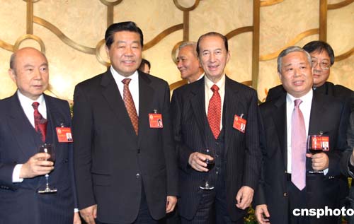 全國政協(xié)辦公廳、中央統(tǒng)戰(zhàn)部三月九日在釣魚臺舉行港澳政委員招待會。賈慶林出席招待會時與澳門政協(xié)委員合影。作者:王辛莉