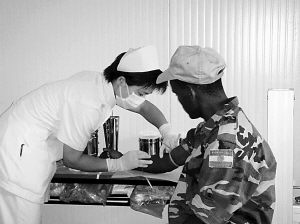 醫(yī)療隊(duì)除了完成好維和部隊(duì)官兵的保障任務(wù),駐地群眾有了疾病,她們同樣精心醫(yī)治。有一次,一名叫克威的當(dāng)?shù)啬星嗄瓴簧醣欢旧咭偷结t(yī)院時(shí)已神志不清,情況十分危急。護(hù)士林秀蓉一邊迅速向隊(duì)領(lǐng)導(dǎo)報(bào)告,一邊協(xié)助醫(yī)生采用清創(chuàng)排毒法救治。2個(gè)多小時(shí)的緊急救治后,克威終于蘇醒過來。由于后續(xù)治療需要輸血,醫(yī)療隊(duì)因不具備條件,又請(qǐng)求直升飛機(jī)將克威護(hù)送到利比里亞首都。飛行途中,林秀蓉多次通報(bào)病人的癥狀,使之順利到達(dá)指定醫(yī)院。兩個(gè)小時(shí)后,終于傳來消息:病人已脫離危險(xiǎn)。參與救治的外國官員評(píng)價(jià):“整個(gè)救治過程緊張而不慌亂,顯示了中國軍人的認(rèn)真精神和醫(yī)術(shù)水平!